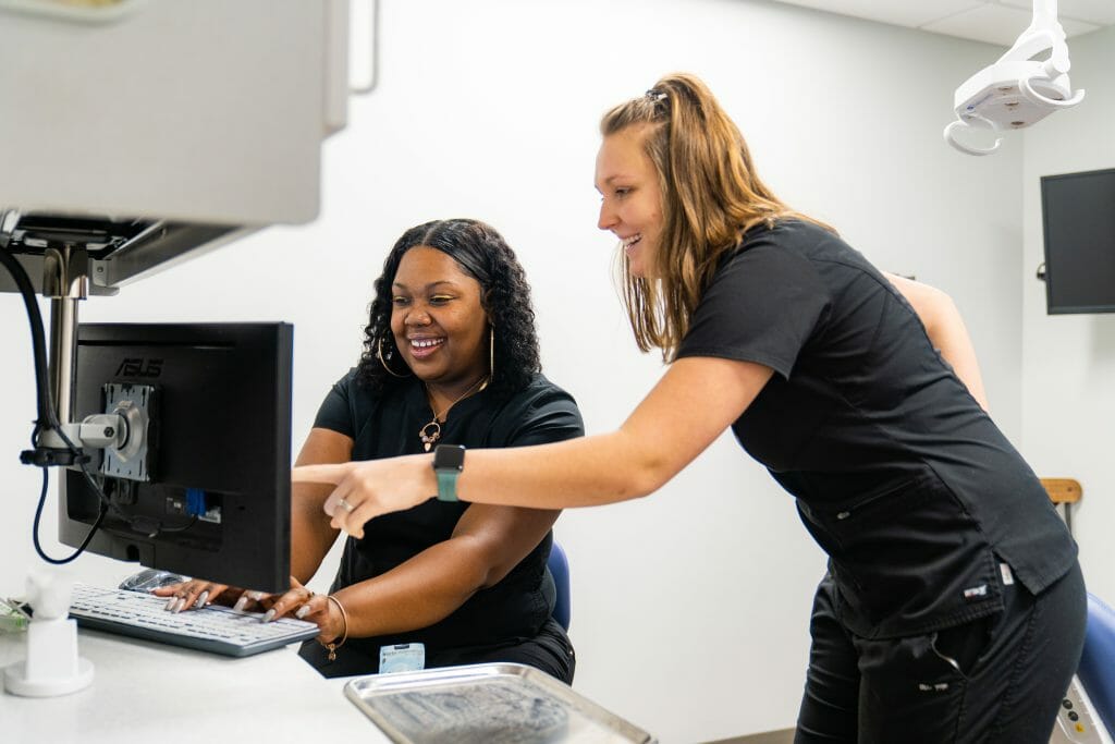 Bleeding GumsMad River Family Dental team member pointing at computer monitor